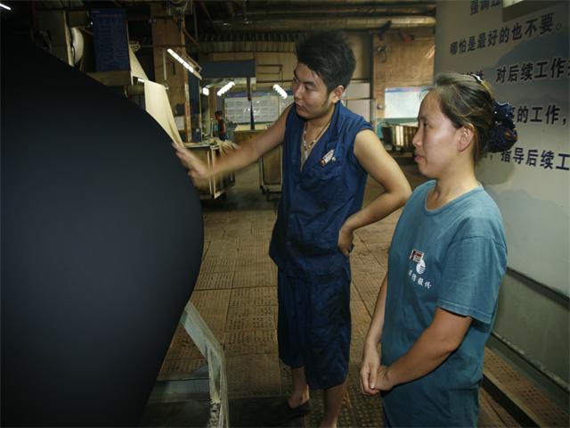圖為面三車間丙班2#拉幅機(jī)擋車工李良(左)與出檢工崔月華,在查看產(chǎn)品質(zhì)量。